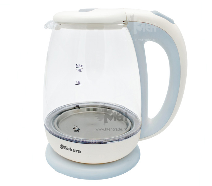 Корпус электрического чайника SAKURA SA-2723 WG выполнен из термостойкого стекла, с применением пищевого пластика. Оформление прибора в светлых тонах придает чайнику особую притягательность. Данная модель может похвастаться увеличенным объемом 1.8 литра, это несомненный плюс для домашнего помощника.