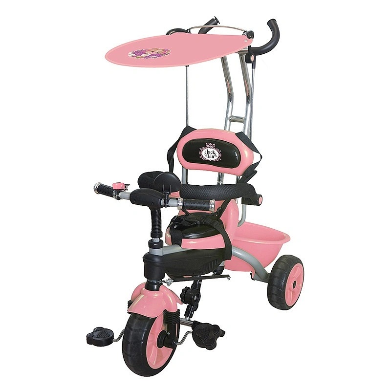 Велосипед детский JackLin с мягким сиденьем. Родительская ручка управления движением. Подножки для ног (складные). Регулируемый козырк-тент с красочным принтом. Вместительная пластиковая корзина для игрушек. Барьер безопасности. Ремни безопасности. Зеркало. Для детей от 1 года до 3-х лет. Цвет: розовый.