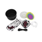 Мультиварка-скороварка укомплектована решеткой пароварки, мерным стаканом, ложкой и половником. А также в наличии набор контейнеров для хранения, кухонная варежка, прихватка и руководство по эксплуатации.