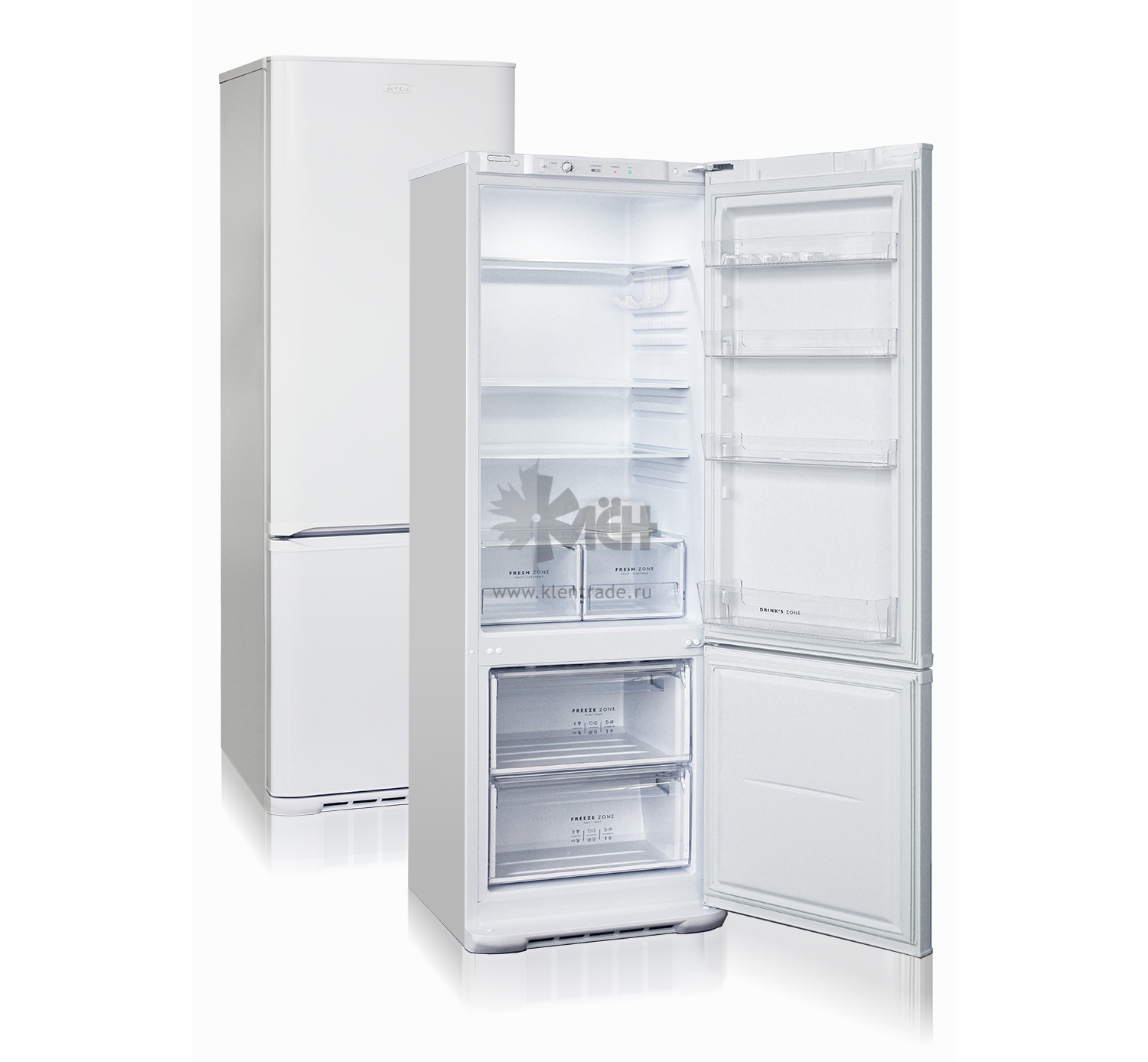 Двухкамерный холодильник Бирюса 632 выполнен в классическом белом корпусе. Морозильником расположен в нижней части.
