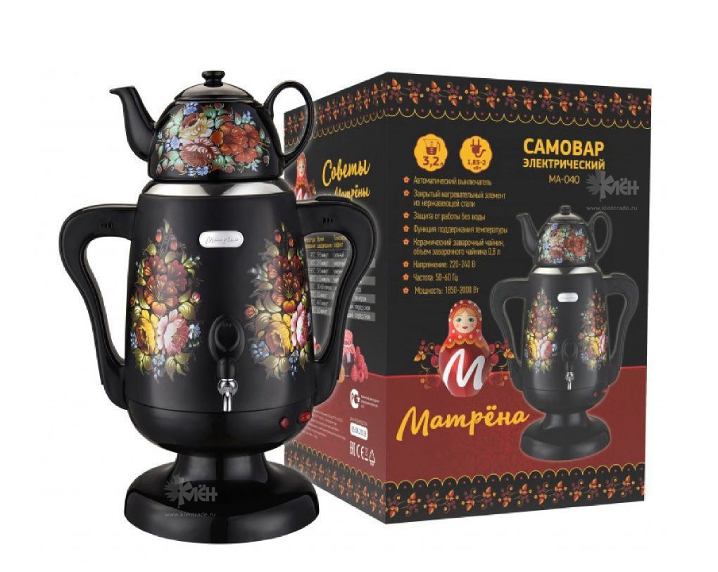 Самовар МАТРЕНА MA-040 станет прекрасной альтернативой обычному чайнику и поможет созданию на кухне уютной атмосферы. Кроме того, данная модель укомплектована керамическим заварочным чайником. Вода в самоваре нагревается максимально быстро, мощность прибора составляет 2000 Вт, и ее температура удерживается длительное время.
