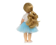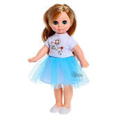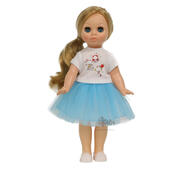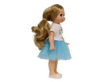 Кукла Эля 24 представлена в летнем комплекте одежды. Пышноя двухслойная юбка-сетка и трикотажная футболка с вышивкой и рукавом,туфельки. Широко распахнутые глаза (закрывающиеся), длинные, шелковистые волосы (16см), рост куклы - 30 см.