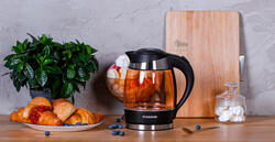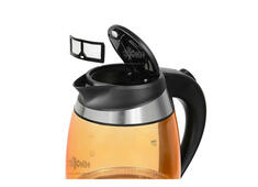 Электрический чайник изготовлен из качественного стекла, которое так же долговечно, как и привлекательно. Рукоятка изготовлена из приятного на ощупь пластика.
