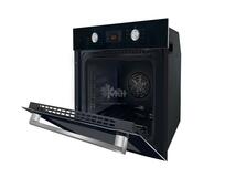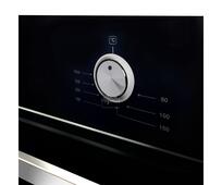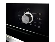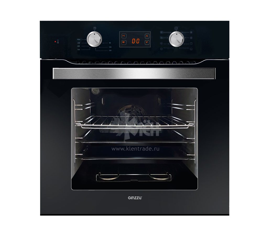 Встраиваемый духовой шкаф GINZZU HOE-205 чёрного цвета с дисплеем и и удобными поворотными ручками выбора программы и температуры.