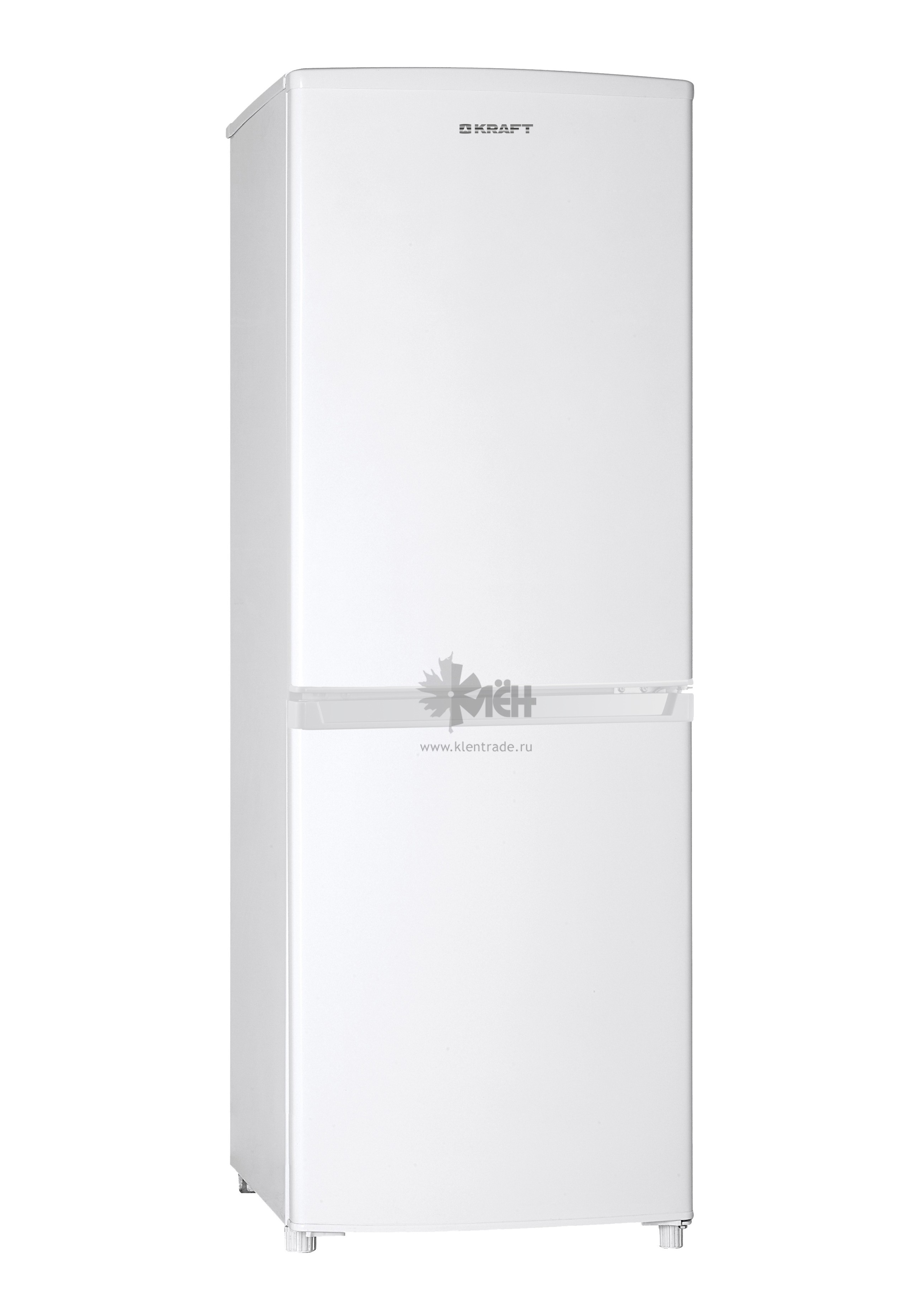 Небольшой двухкамерный холодильник KRAFT выполнен в классической белой расцветке. Морозильная камера расположена в нижней части.