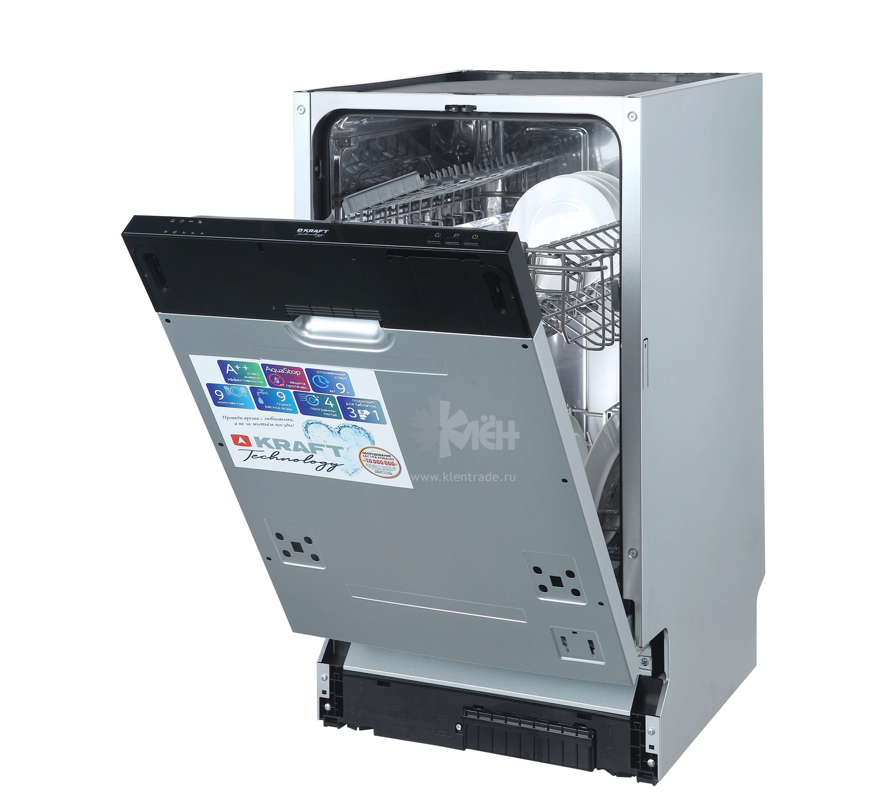 Встраиваемая посудомоечная машина KRAFT TCH-DM454D901SBI надежно защищена от протечек. Прибор оснащён 4 программами мойки.