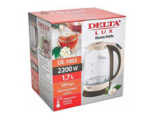 Электрический чайник DELTA LUX DL-1003 имеет корпус из высококачественного жаропрочного стекла. Прибор оснащен закрытым нагревательным элементом из нержавеющей стали, съемным фильтром от накипи, отсеком для хранения электро шнура, электронной панелью управления. Имеются функции автоматического отключения при закипании и блокировки включения без воды.
