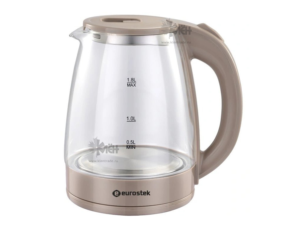 Eurostek EEK-2033 это современный электрический чайник. Корпус прибора выполнен из качественного термостойкого стекла и термостойкого пластика бежевой расцветки.