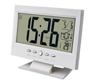 Часы-будильник умеют измерять температуру в помещении. Питание от 2 батареек ААА. На монохромном дисплее одновременно отображаются два времени, дата, день недели и температура. Встроенный будильник имеет функцию повтора. Можно выбрать из восьми мелодий будильника. Функция таймера. Включение подсветки дисплея хлопком.