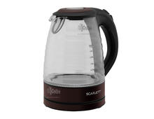 Электрический чайник SCARLETT SC-EK 27 G97 имеет сбалансированный дизайн – прозрачный корпус из ударостойкого стекла Crystal Pro и лаконичная декорация шоколадного цвета придают прибору особый шарм.