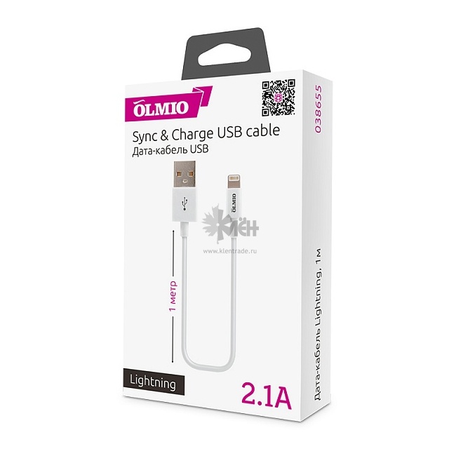 Дата-кабель USB2.0- IPhone (Lightning) 1.0м OLMIO 2.1A белый