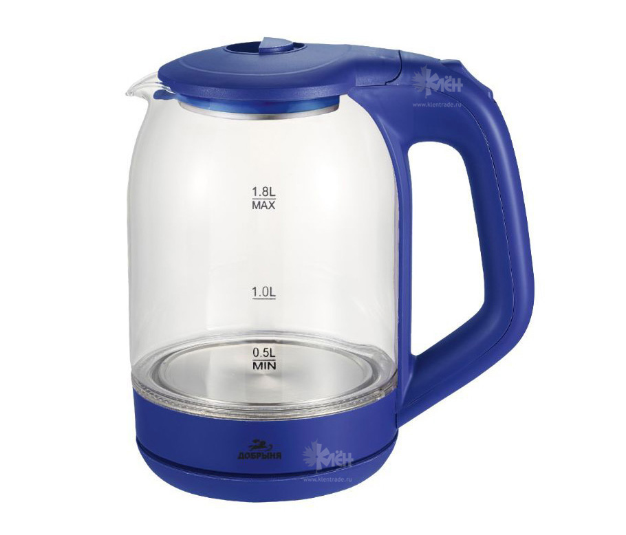 ДОБРЫНЯ DO-1238D это современный электрический чайник. Корпус прибора выполнен из качественного термостойкого стекла и термостойкого пластика синей расцветки.