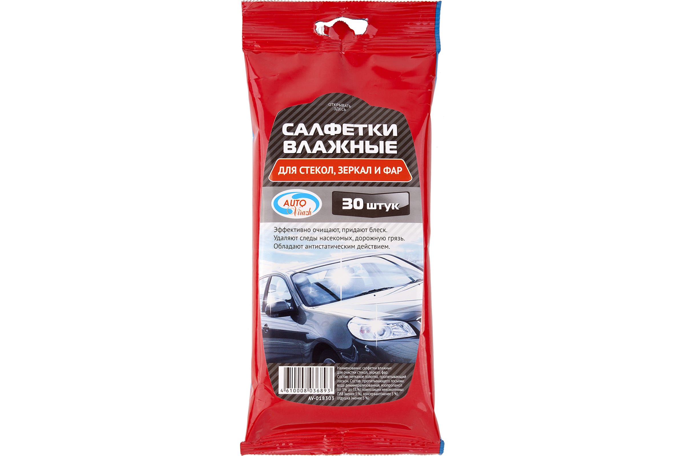 Салфетка влаж Auto virazht для стекол, зеркал,фар 30шт 018-303