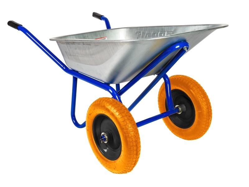 Тачка строительная двухколесная BRAIT 200 (полиуретан) с оцинкованным корытом емкостью 100 литров и грузоподъемностью до 200 кг кг. Тачка предназначена для тяжелых работ на строительной площадке и в саду. На тачке можно перевозить различные грузы: строй материалы, дачный мусор, дрова для печи, мебель. За счет особой конструктивной формы тачка выдерживает большие нагрузки 200 кг