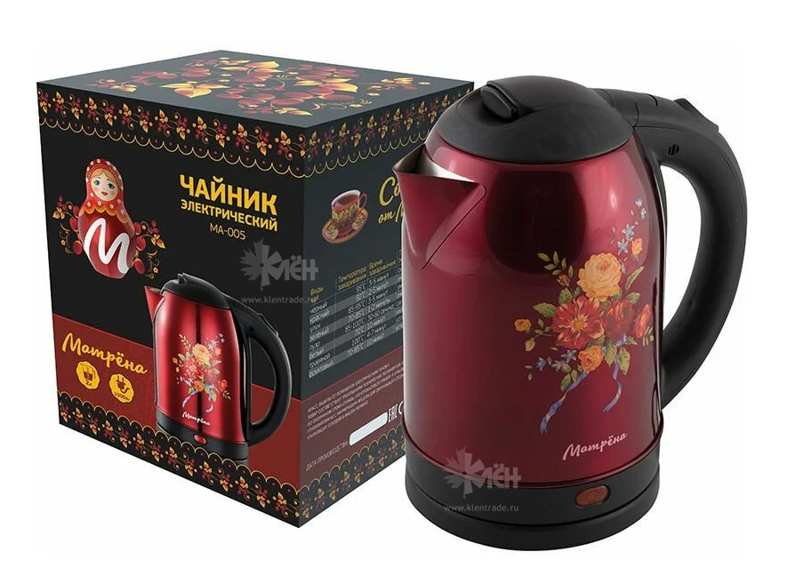 Цветочное решение оформления дизайна чайника МАТРЕНА МА-005 "Хохлома", принесет только положительные эмоции от пользования прибором. Чайник станет прекрасным подарком и поводом собрать всех за столом. Увеличенная вместительность электрического прибора на 2 литра позволит угостить целую компанию горячими напитками.