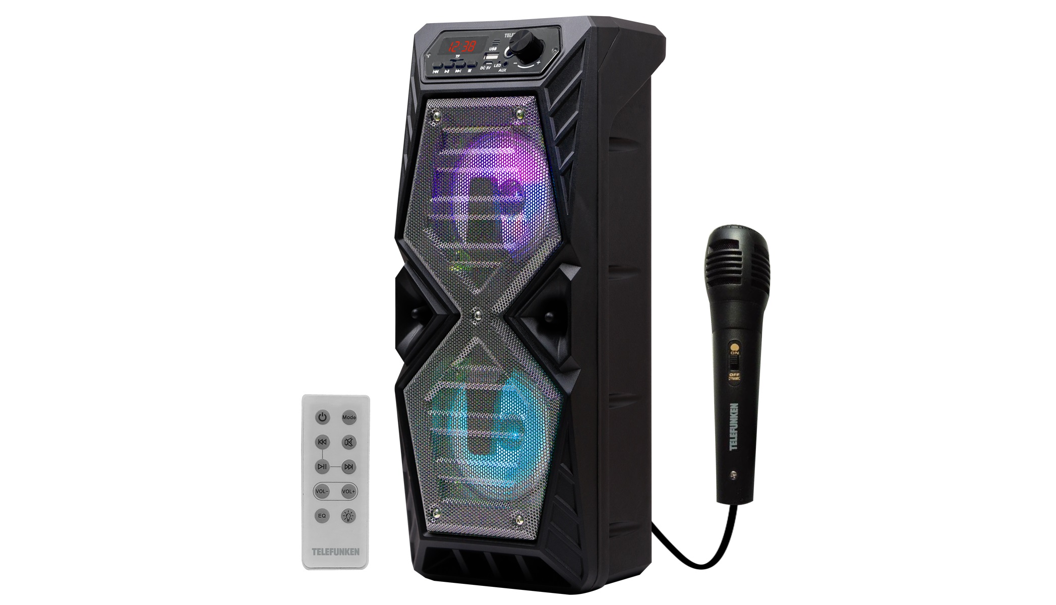 Проводной микрофон, ПДУ, адаптер питания, AUX