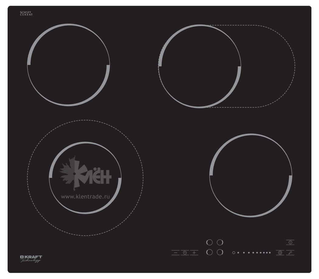 Независимая стеклокерамическая варочная панель KRAFT TCH-EHK6602 - удобная модель с четырьмя конфорками, две из которых имеют зоны расширения.