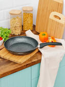 Сковорода КАТУНЬ КТ-АЛ03-С26 имеет диаметр 26см, внутри антипригарным мраморным покрытием. Подходит для посудомоечных машин и индукционных плит.