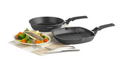 Благодаря особой технологии внешние стенки посуды имеют фактурную поверхность, что в сочетании с благородным темно-серым цветом выглядит невероятно стильно и современно. Пользоваться сковородой очень удобно: стильные ручка изготовлена из ненагревающегося бакелита с приятным на ощупь покрытием Soft Touch.