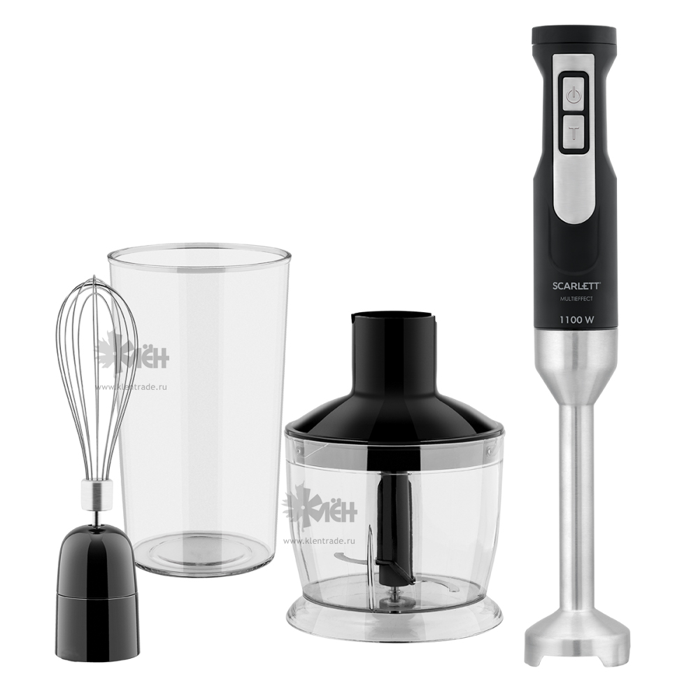 Погружной блендер SCARLETT HB 42F 61 3/1 оснащён мощным мотором высокой мощности 1100 Вт, к нему прилагается мини-измельчитель, мерный стакан и венчик, с помощью которых можно измельчать продукты, готовить тесто, взбивать крем, выполнять другие задачи.