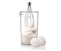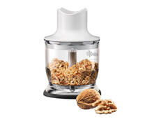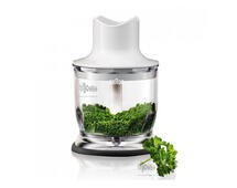 В комплекте к нему идёт мини-измельчитель, венчик для взбивания и подходящий по размерам мерный стакан. К нему также прилагается насадка, созданная специально для того, чтобы препятствовать разбрызгиванию продуктов.
