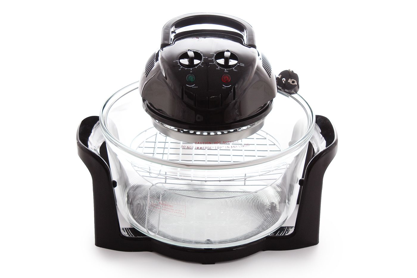 BINATONE HOV-122 механический аэрогриль с электрическим нагревательным элементом. Корпус аэрогриля выполнен в черном цвете. На фронтальной стороне устройства расположены индикатор включения, таймер и регулятор нагрева. Эта конвекционная печь оснащена стеклянной чашей. Объем колбы 12 л. Номинальная мощность устройства 1,3 кВт.