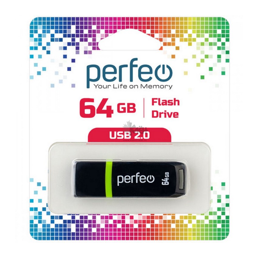 USB накопитель Perfeo с колпачком, модель C11 объемом памяти 64GB, чёрного цвета имеет компактный размер.