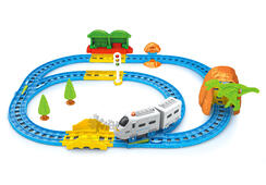 Современный поезд отправляется в путь по яркой железной дороге. Любой мальчишка с удовольствием станет машинистом состава и доставит пассажиров к месту назначения. Во время движения вагоны проедут по мосту и через тоннель со свирепым динозавром. Ребёнок переведёт железнодорожные стрелки и направит поезд по одному из двух маршрутов.