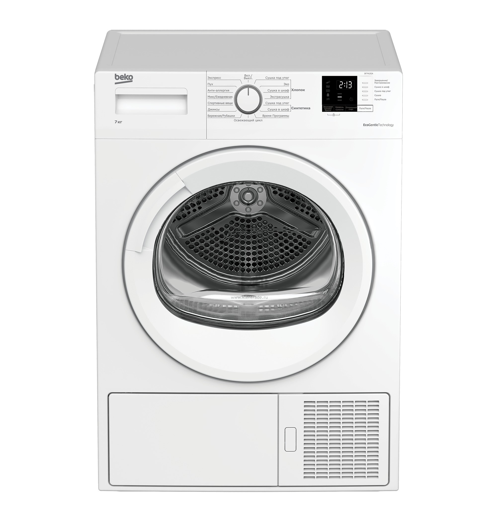 Сушильная машина Beko DF7412GA глубиной 45 см с максимальной загрузкой барабана 7 кг и 15 программами работы, включая режим "Сушка в шкаф", программы для детской, спортивной и джинсовой одежды.