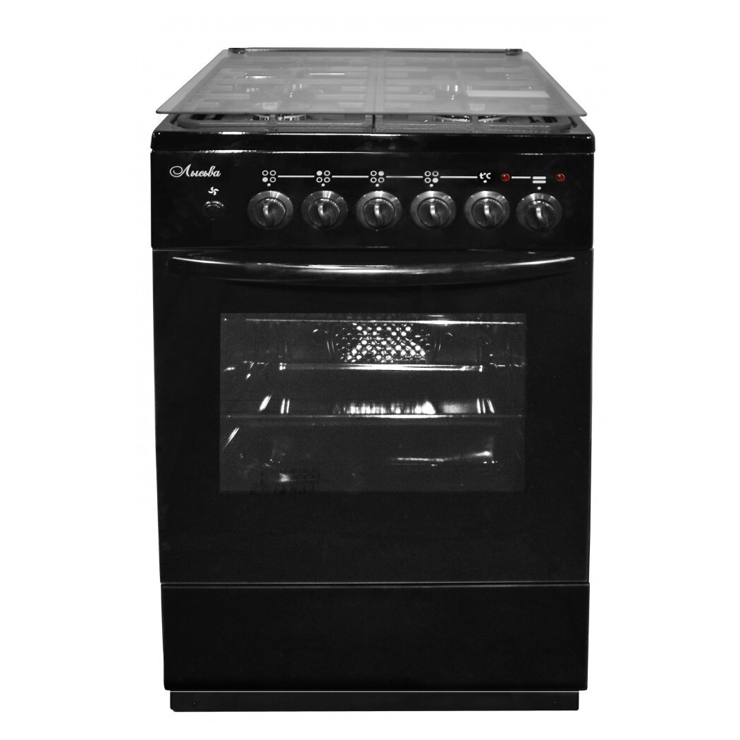 Комбинированная плита с электрической духовкой Лысьва ЭГ 404МС-2у представлена в чёрном корпусе со стеклянной крышкой.