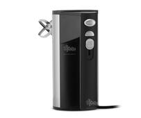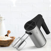 В комплект к миксеру входят два вида насадок - венчики для взбивания и крюки для теста: они отсоединяются от корпуса легким нажатием специальной кнопки.