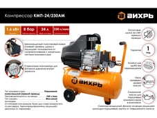 Компрессор Вихрь КМП-24/230АМ используется для нагнетания сжатого воздуха в различное пневмооборудование в ходе строительно-ремонтных работ в квартире или на даче. Максимальная производительность компрессора 230 литров в минуту, объем ресивера 24 литра.