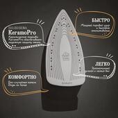 Модель оснащена керамической подошвой Keramo Pro – материала, который позволяет ей с легкостью скользить по тканям различных типов, не оставляя на них блестящих следов. Увеличенный до 400 мл резервуар позволяет долго гладить без долива воды.
