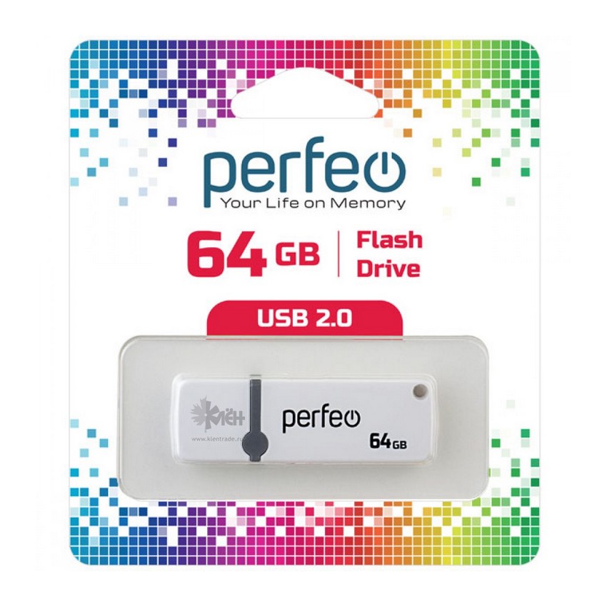 USB накопитель Perfeo с колпачком, модель C07 объемом памяти 64GB, белого цвета имеет компактный размер.
