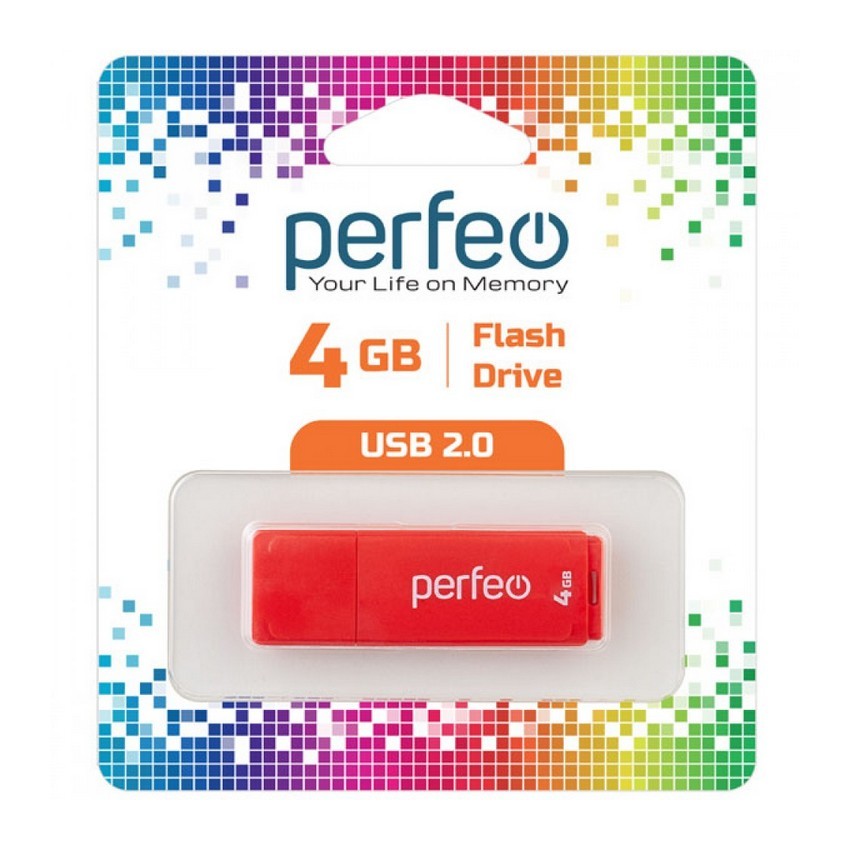 USB накопитель Perfeo C04 с колпачком, модель объёмом памяти 4GB, красного цвета имеет компактный размер.