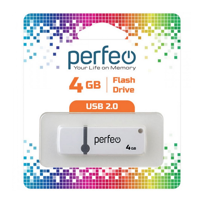 USB накопитель Perfeo C07 с колпачком, модель объёмом памяти 4GB, белого цвета имеет компактный размер.