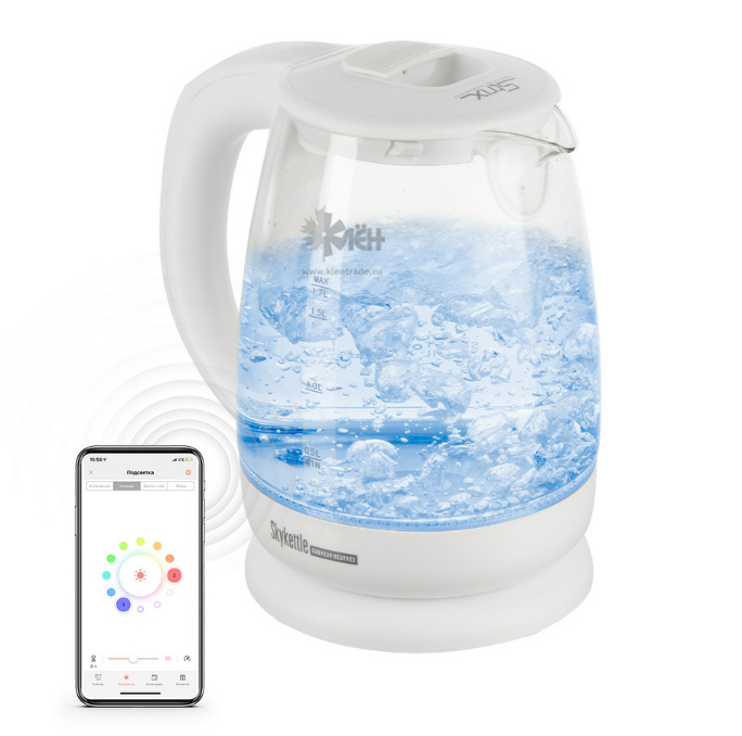 Чайник REDMOND SkyKettle оснащен светодиодной подсветкой. С мобильного устройства можно выбрать цвет и яркость подсвечивания колбы, установить время смены оттенков в интервале от 30 сек. до 3 мин.