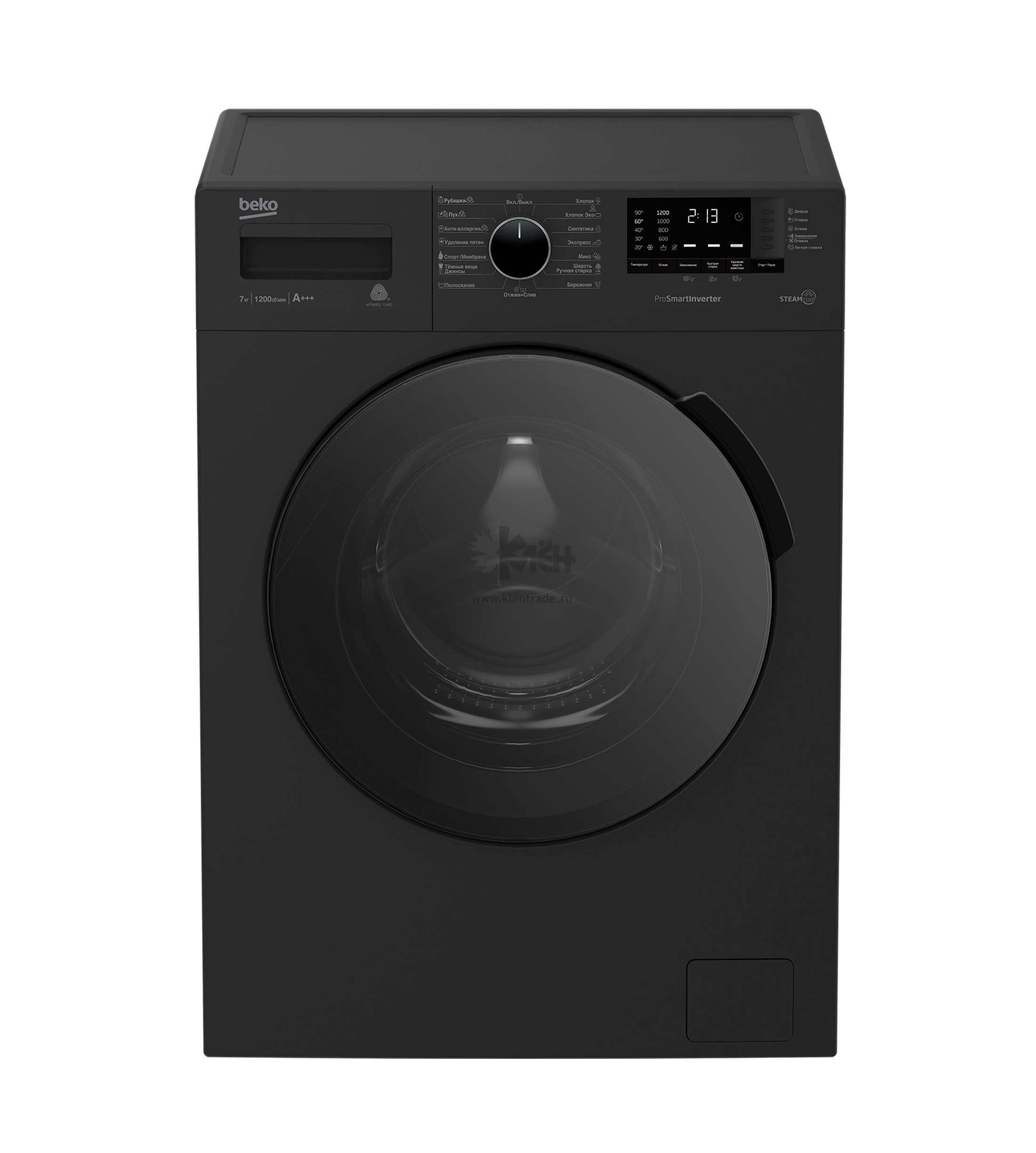 Антрацитовая стиральная машина Beko с 15 программами стирки для разных типов ткани, гипоаллергенной и быстрой стирки за 14 минут и специальными режимами для стирки рубашек, джинсовых вещей и пуховиков.