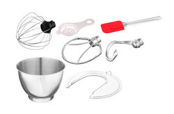 Комплектуется товар лопаткой для перемешивания компонентов, взбивающим венчиком, крюком для теста причудливой формы, разделителем белка и желтка.