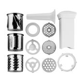 В комплект входят: насадка овощерезка для шинковки, две насадки овощерезки-тёрки, три перфорированных диска разного диаметра, алюминиевый лоток, а также насадки для набивания колбас, насадка для кеббе, толкатель.