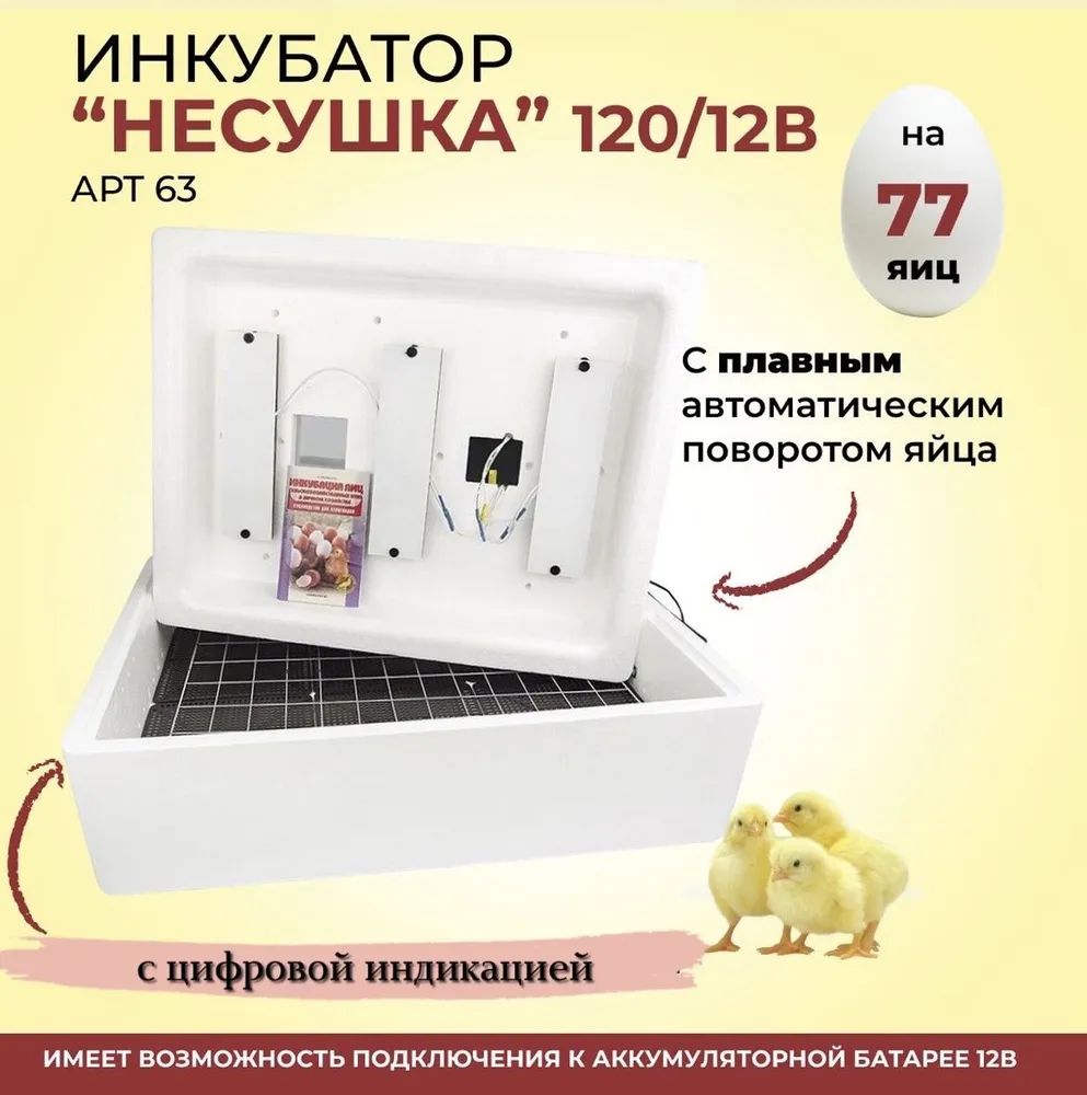 Инкубатор Несушка 77 (220В/12В) авт.поворот, цифр.терморег., принудит.вентил. (63в)