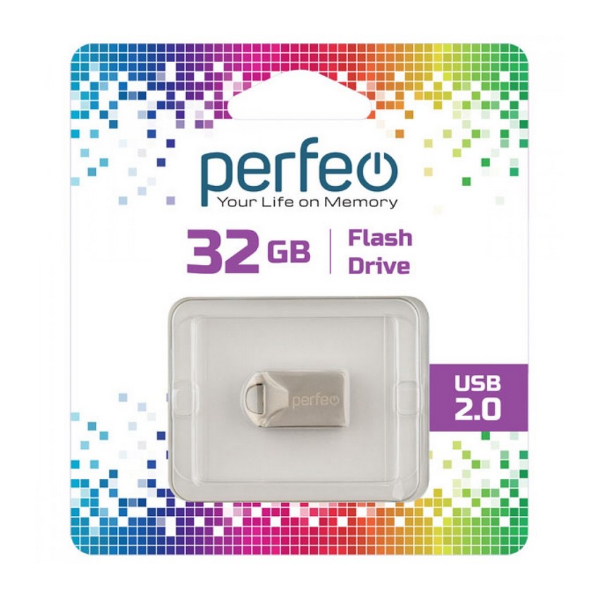 USB накопитель Perfeo M10 без колпачка, серии МИНИ, модель объёмом памяти 32GB, интерфейсом USB 2.0, серебристого цвета имеет компактный размер.