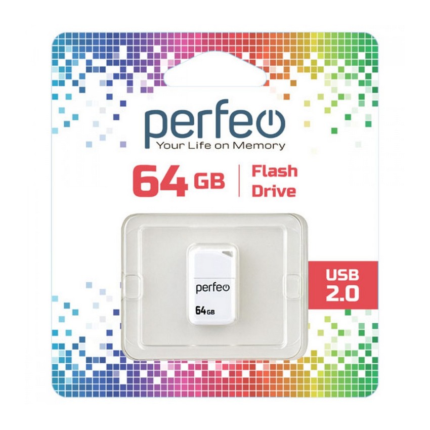 USB накопитель Perfeo M03 с колпачком, модель объёмом памяти 64GB, белого цвета имеет компактный размер.
