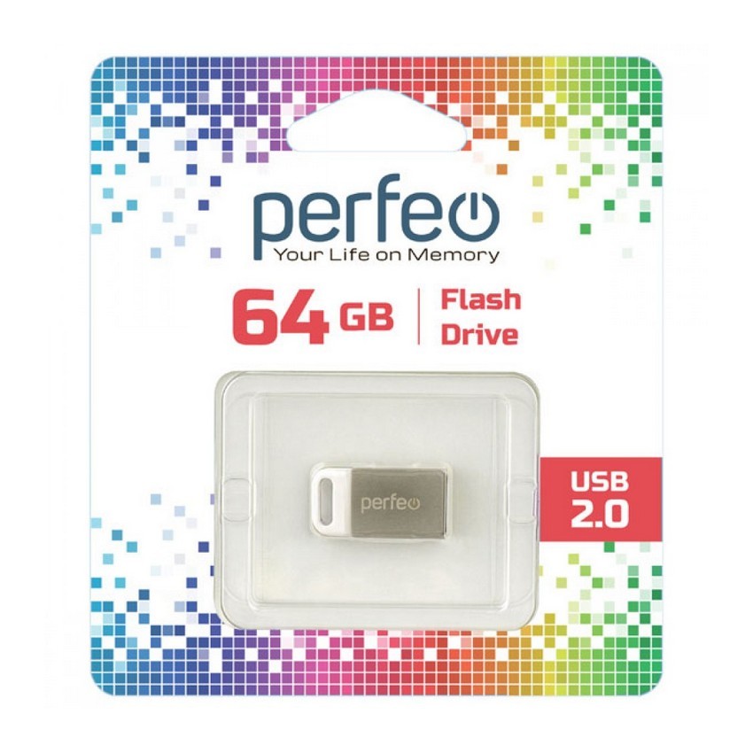 USB накопитель Perfeo M05 без колпачка, серии МИНИ объёмом памяти 64GB, интерфейсом USB 2.0, серебристого цвета имеет компактный размер.