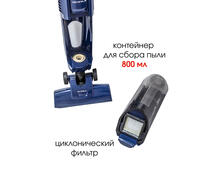 Мощность всасывания 150 Вт и циклонный фильтр дают пылесосу возможность эффективно справиться с пылью и мелким мусором. Загрязнения попадают в специальный контейнер, который после заполнения можно легко отсоединить, чтобы вытряхнуть содержимое в ведро, а затем вернуть на место.