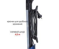 Сетевой шнур длиной 4,5 метра обеспечивает большой радиус действия. Продуманная конструкция позволяет хранить устройство в вертикальном положении, чтобы сэкономить место в квартире.