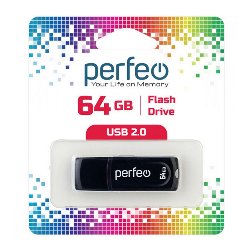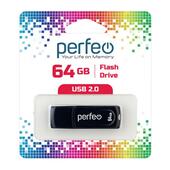 USB накопитель Perfeo с колпачком, модель C09 объемом памяти 64GB, черного цвета имеет компактный размер.