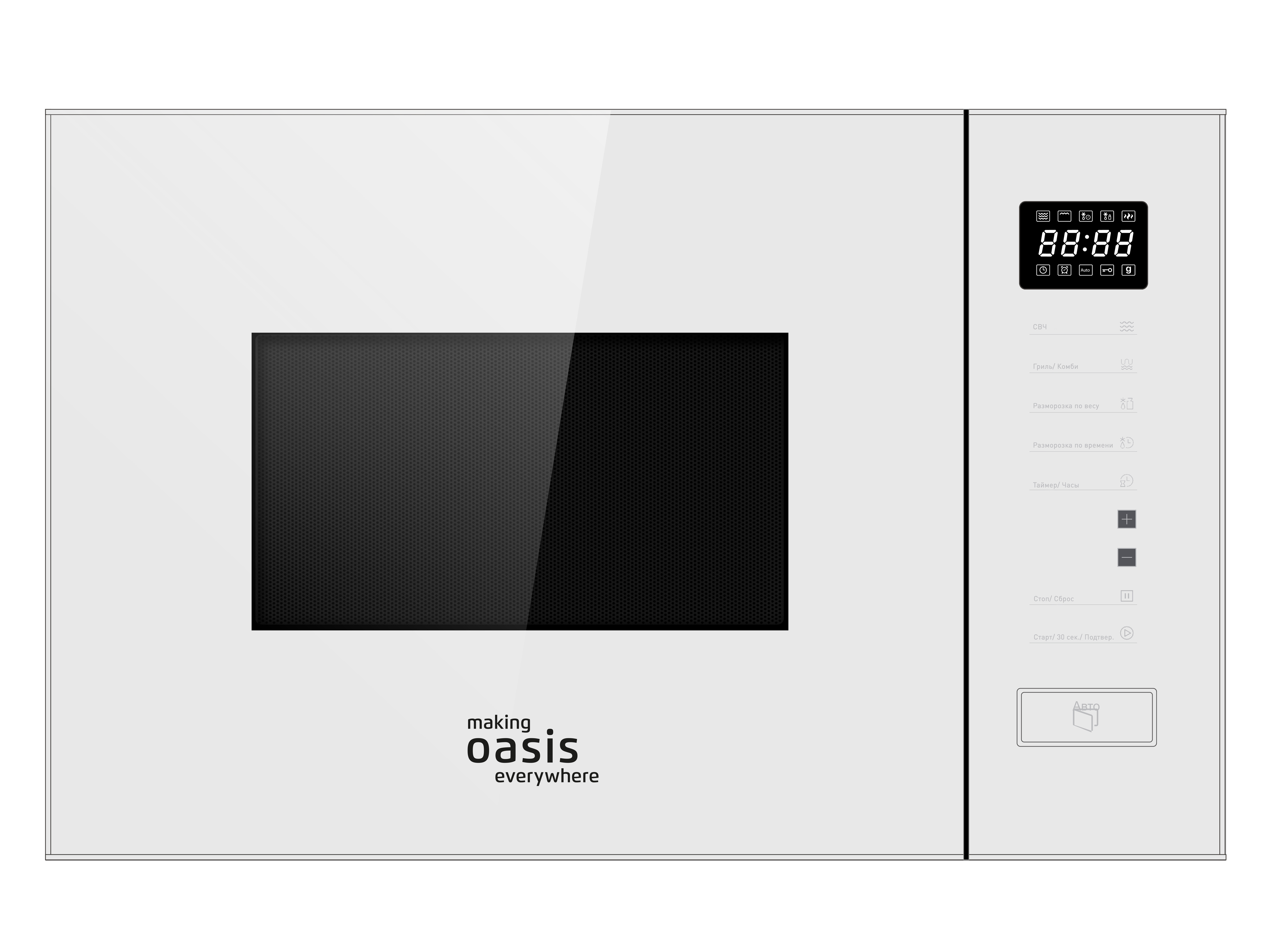 Встраиваемая микроволновая печь Oasis everywhere MW-SGW может похвастаться наличием встроенного дисплея и сенсорной панели управления, что позволит максимально быстро и точно установить параметры ее предстоящей работы.