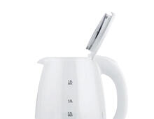 Нагревательный элемент скрыт в нижней части модели, что защищает его от появления накипи. Также на корпус прибора нанесена шкала с отметками минимума и максимума для визуального контроля уровня наполненности чайника.