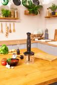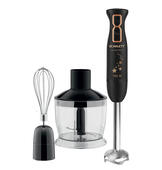 Функциональность блендера обеспечивает продуманный комплект: чаша-измельчитель, погружной блендер, венчик для взбивания. Объем чаши 0,6 л – этого более чем достаточно для приготовления нескольких порций блюд. Ножу MULTIEFFECT, выполненному из нержавеющей, износостойкой стали STEEL PRO, "по зубам" любые продукты – он оснащен вертикальными укороченными лезвиями, которые увеличивают режущие свойства ножа. А с насадкой-венчиком взбить тесто или сделать крем станет делом нескольких минут.
